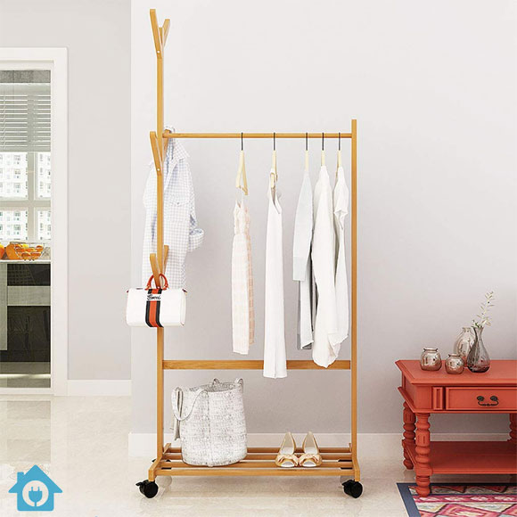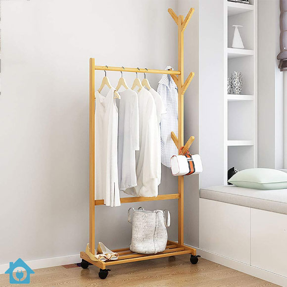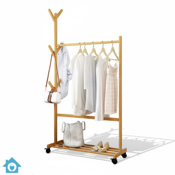 A modern bamboo wood standing coat rack designed as a floor hanger solution for organizing clothes, coats, bags, and accessories in style.