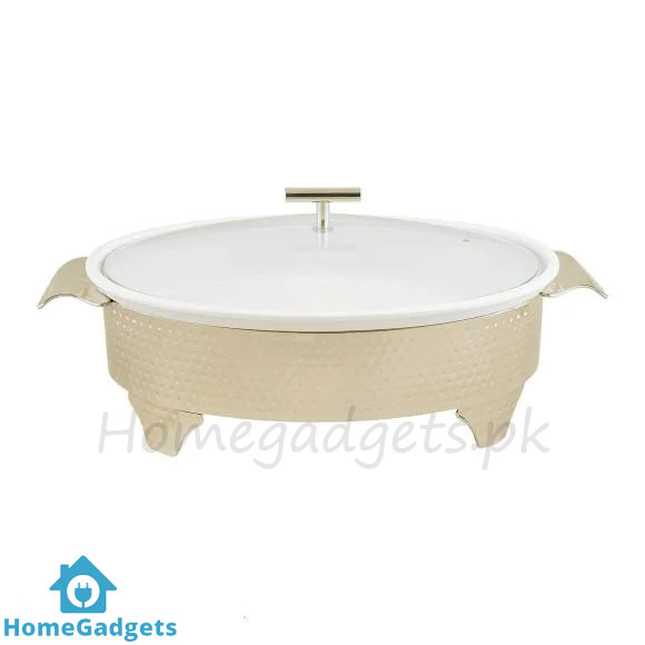 The oval design of this dish provides a unique and modern look, while the 14.5-inch size makes it spacious enough to hold generous portions of rice, biryani, pasta, curries, and even desserts. Its elegant finish complements both traditional and contemporary dining setups, making it an essential part of any Pakistani household. The built-in candle stand is one of its most attractive features, as it allows continuous heating during buffets and parties without the need for constant reheating.