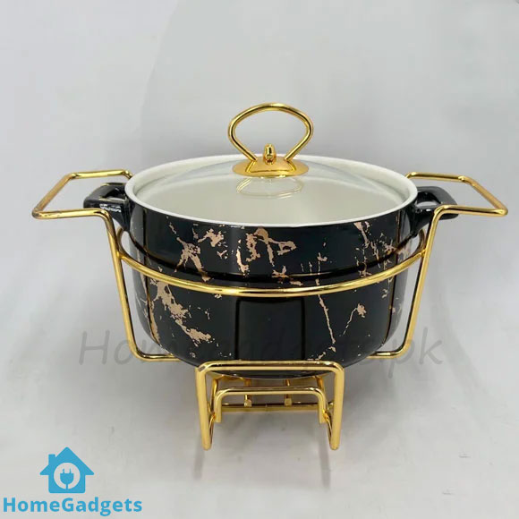 The Ceramic Chafing Dish Set Buffet Warmer comes with beautifully crafted dishes, lids, and a sturdy metallic stand with a heating system. It uses tea light candles or burners to maintain the perfect serving temperature without burning or drying out food. Its sleek design makes it suitable for formal dinners, daawats, and professional catering setups.