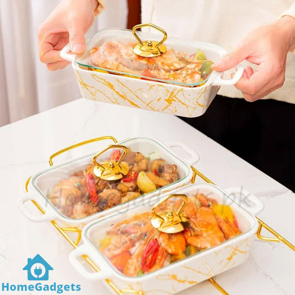 Crafted with high-grade ceramic, each bowl is durable, heat-resistant, and hygienic. The set also comes with glass lids to keep food fresh, visible, and well-presented. The metal stand is sturdy, providing balance and a professional look on any buffet table.