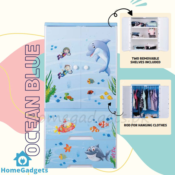 Organize your child’s clothes with this Kideez plastic hanging wardrobe featuring 5 layers, 2 drawers, and a playful Ocean Blue theme. Lightweight, durable, and easy to assemble.