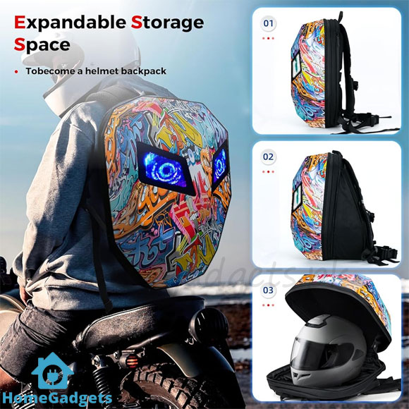 The Giraftti Knight Motorcycle Backpack is designed for bikers who want safety, style, and innovation. Featuring customizable LED eyes, this backpack allows you to display animations, texts, and pictures directly from a smartphone app, making your ride unique and eye-catching.