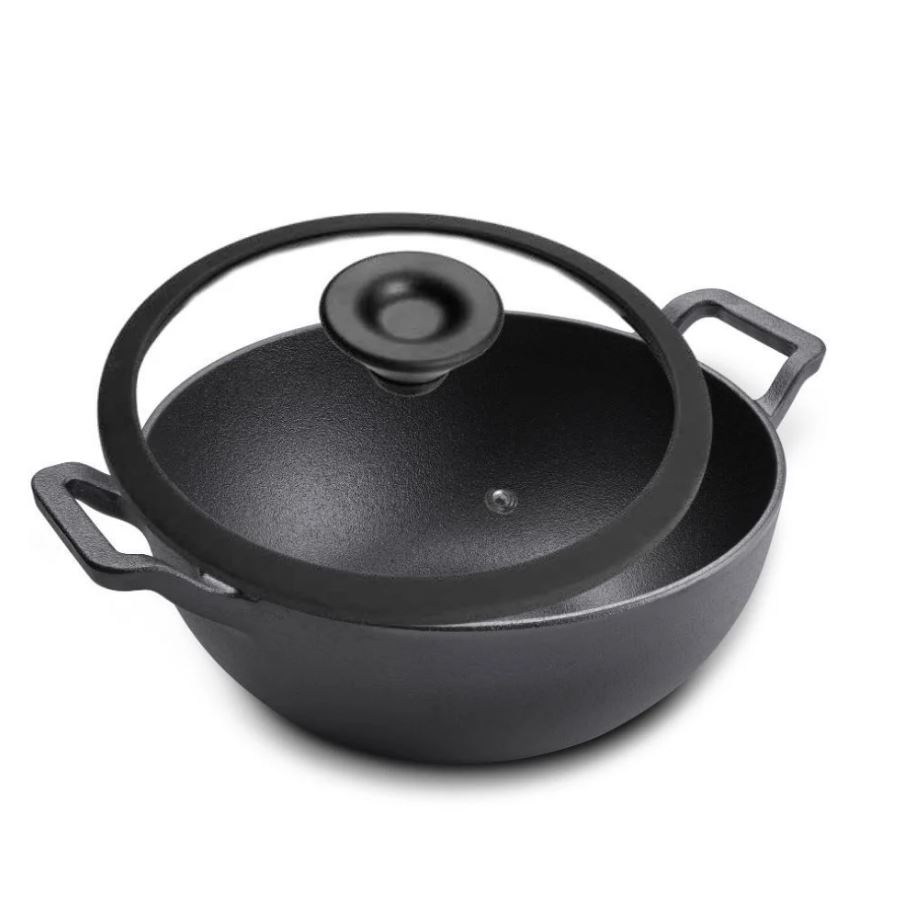 Crafted from high-quality cast iron, this 20cm deep wok-style kadai is ideal for tarka, frying, deep sautéing, curry preparation, and roasting. It ensures even heat distribution, superior heat retention, and high-temperature performance for a wide range of Pakistani dishes—like chana masala, daal tarka, karahi gosht, and more.