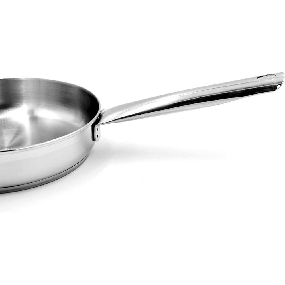 The encapsulated base ensures even heat distribution, while the mirror-polished exterior adds elegance to your kitchen. The stainless steel riveted handle remains cool to the touch and offers a firm grip.